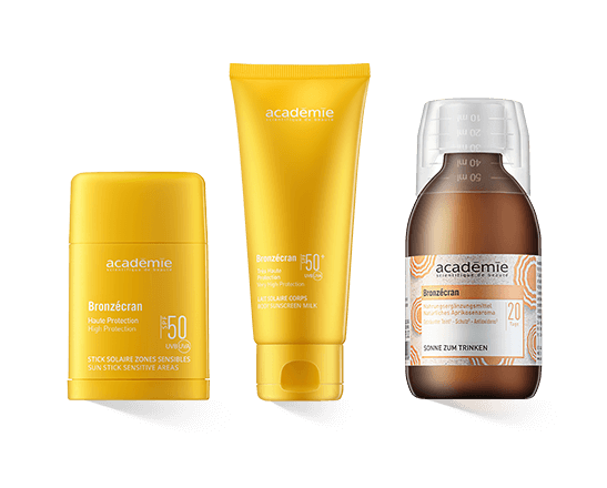 Het assortiment voor zonnebaden omvat meer dan tien producten, van de lichte verzorgingsmelk Lait pour le Corps met SPF 15 tot de rijke, goed beschermende Académie Bronzécran Crème Solaire Anti-Rides Visage met antiverouderingsmiddelen en SPF 20 of 40 tot de zelfbruinende lotion Gel Bronzécran Sport Teinté met lichte SPF 6 voor niet-zonnegevoelige types. De Bronzécran Stick Solaire Zones Sensibles met SPF 50, die blootgestelde delen van de huid beschermt, en de Académie Bronzécran Spray Peaux Intolérantes au Soleil SPF 50 zijn ook ontworpen voor de bijzonder gevoelige huid.