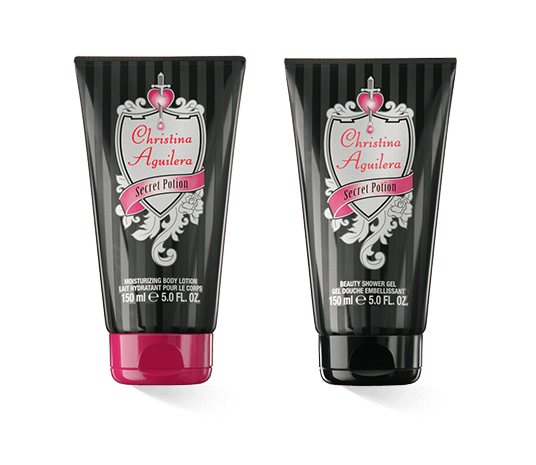 Haar donkergekleurde ogen stralen vrouwelijke allure en sensueel exotisme uit en belichamen het effect van de vrouwelijke geur. Het glamoureuze, sensuele beeld van de kunstenaar wordt vergezeld door de naam "Christina Aguilera " in roze, waaronder "Secret Potion " staat geschreven in witte, delicate letters. Christina Aguilera 's motto voor de sensuele vrouwengeur "Het geheim van je sprankelende verschijning" staat ook in roze hoofdletters en vertegenwoordigt het mysterieuze zelfvertrouwen van de geur, die elke vrouw haar sensuele aantrekkingskracht geeft. De roze flacon en de zwarte verpakking ernaast zijn onderaan de afbeelding te zien. Christina Aguilera charmeert niet alleen als de ontwerper van het eau de parfum, maar ook als sensueel en exotisch model in de stijlvolle en zelfverzekerde campagne, die de fruitig-oriëntaalse geur op een aantrekkelijke manier weerspiegelt.