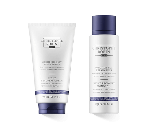 Christophe Robin Night Recovery bestaat uit een olie en een crème voor de lengten en punten van het haar. De lijn maakt gebruik van de verzachtende en beschermende effecten van witte lotus, die al lang wordt gebruikt in huidverzorging. De Night Recovery Monoï Oil is gebaseerd op traditionele Polynesische cosmetica. Het bestaat uit kokosolie en de witte bloemen van de tiare plant, die voor zonsopgang worden geoogst. Pas dan geven de bloemen hun voedende en hydraterende bestanddelen en geur af aan de kokosolie.