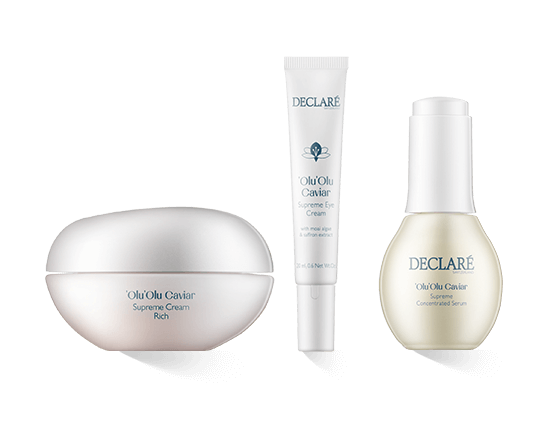 De collectie - bestaande uit vier essentiële huidverzorgingsproducten met hoogtepunten zoals de Supreme Cream Rich en het Supreme Concentrated Serum - is gericht op mensen die de kracht van natuurlijke essences waarderen voor holistische gezichtsverzorging. Vooral de gevoelige huid wordt gekalmeerd bij regelmatig gebruik van de huidverzorgingslijn. Deze exquise huidverzorgingslijn heeft ook een diepwerkend, hydraterend en merkbaar plumping effect. Verpakt in elegant glanzende, gesatineerde verpakkingen zoals crèmepotjes die doen denken aan rivierstenen en schelpparels, zijn de producten uit de Declaré 'Olu'Olu Caviar Supreme-lijn een decoratief hoogtepunt in de badkamer dat ook qua designesthetiek ongeëvenaard is.