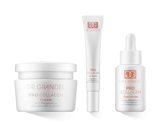 Hiertoe behoort de Dr. Grandel Pro Collagen Oogcrème, die speciaal is ontwikkeld voor het gevoelige gebied rond de ogen, dat in het bijzonder wordt aangetast door rimpels. De Dr. Grandel Pro Collagen Crème Rijk verzacht de bijzonder droge huid met een nog rijkere formule. De Dr. Grandel Pro Collagen Crème is ontwikkeld voor alle huidtypes. Het Dr. Grandel Pro Concentrate serum is een kick voor de huid: slechts een paar druppels in de huidverzorgingsroutine leiden tot direct zichtbare resultaten. De huid wordt gestimuleerd en opnieuw opgebouwd.<
