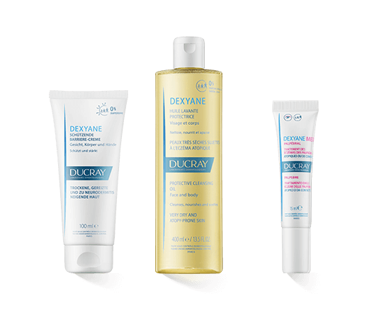 De Ducray Dexyane verzorgingslijn is speciaal ontwikkeld voor de zeer droge en atopische huid. Het is ontworpen om snel de onaangename jeuk te verlichten en helpt ook om de natuurlijke beschermende barrières van de huid te verbeteren bij regelmatig gebruik. De lijn biedt de droge huid en de huid met neiging tot atopische dermatitis een routine voor het reinigen en verzorgen van gezicht en lichaam die geschikt is voor dagelijks gebruik.
