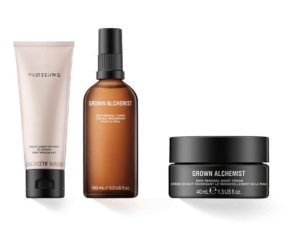 Eerste hulp voor de gestreste huid! De exclusieve Grown Alchemist Skin Renewal huidverzorgingslijn kalmeert de geïrriteerde en gestreste huid, revitaliseert haar en beschermt de natuurlijke barrière van de huid. De rijke formules zitten vol krachtige actieve ingrediënten die de veerkracht en elasticiteit van de huid verbeteren, fijne lijntjes en rimpels doen verdwijnen en de teint een gezonde, stralende gloed geven. Voor een mooie huid die er niet alleen goed uitziet, maar ook goed aanvoelt.