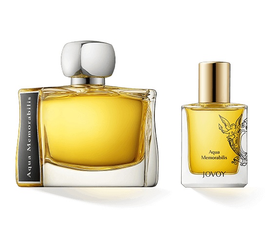 Jovoy Aqua Memorabilis is een extravagante geur, wat ook terug te vinden is in het ontwerp van de flacon. De hoogglans gepolijste flacon wordt gekenmerkt door zijn organische lijnen. Alleen de basis en de bovenkant zijn recht, de rest is golvend en gebogen, net als de glanzend zilveren dop. De naam van het parfum staat niet zoals gebruikelijk op de brede kant, maar op de smalle kant. Daar is een zwart plaatje bevestigd, waarvan de vorm doet denken aan een zandloper. Het wordt omrand door een zilveren frame dat perfect harmonieert met de dop. De naam staat erop in zilveren letters. De vloeistof glinstert door het glas in een sterke gouden tint en belichaamt het stralende karakter van deze energieke geur.