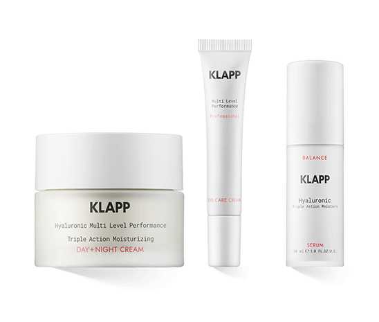 Regelmatig gebruik van de op elkaar afgestemde producten uit de KLAPP Hyaluronic Multi Level Performance-lijn verhoogt het hyaluronzuur- en vochtgehalte van de huid. De teint krijgt een frisse uitstraling, contouren lijken prominenter en worden benadrukt. De intensiteit van de verzorging kan worden aangepast aan individuele behoeften met serum, crème, gel en booster.