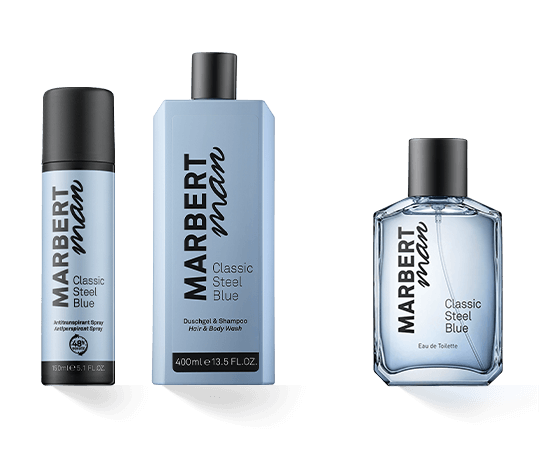 De Marbert Man Classic Steel Blue geurserie is gelanceerd in 2021, met eau de toilette, after shave en douchegel & shampoo is de frisse geur in verschillende producten verkrijgbaar voor mannen. De geur begint fris en fruitig met verschillende tropische vruchten en zwarte bessen. De hartnoot combineert vele bloesems tot een delicate bloemengeur, die aardser en kruidiger wordt met vetiver en eikenmos in de basis. De geur doet denken aan klassieke mannengeuren, die indruk maken met aquatische frisheid en perfect passen bij een dynamische man. De geur blijft niet lang hangen, waardoor deze geur geschikt is voor vele gelegenheden overdag en 's avonds.