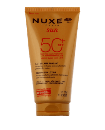 Nuxe Sun Lait Fondant Haute Protection SPF 50 beschermt het gezicht en lichaam met een zeer effectief UV-A/UV-B-filtercomplex en tegen blauw licht en dus tegen door licht veroorzaakte huidveroudering en pigmentvlekken. De smeltende textuur wordt zonder strepen opgenomen, hydrateert onmiddellijk en geeft de huid een aangenaam gevoed gevoel. Het product is waterproof, niet-comedogeen en geschikt voor alle huidtypes. De zonnige geur van zoete sinaasappel, tiare en vanille maakt van elke applicatie een sensueel zomermoment.