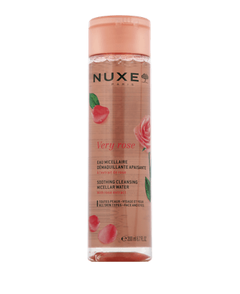 De Nuxe Very Rose Eau Micellaire Démaquillante Apaisante verwijdert make-up bijzonder mild van gezicht en ogen. De frisse micellaire formule met rozenextract bestaat voor 99 procent uit ingrediënten van natuurlijke oorsprong en is geschikt voor alle huidtypes. Het reinigt effectief, hydrateert onmiddellijk en kalmeert de huid. De niet-plakkerige textuur en delicate rozengeur laten de huid aangenaam zacht aanvoelen en bereiden de huid optimaal voor op verdere verzorging.