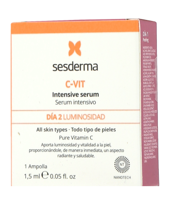 Een klein powerpack met een groot effect! Het Sesderma C-Vit Intensive Serum werkt als een instant verjongingskuur voor de huid. De formule met hooggeconcentreerde vitamine C revitaliseert de huid onmiddellijk, verheldert haar zichtbaar en geeft haar een onweerstaanbare glans en jeugdige frisheid. Het egaliseert de teint, versterkt de huid van binnenuit, biedt effectieve en langdurige bescherming tegen vrije radicalen en bestrijdt zichtbare tekenen van vermoeidheid.