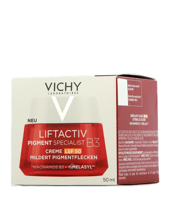 De Pigment Specialist B3 SPF 50 crème van Vichy Liftactive vermindert pigmentvlekken en rimpels bij vrouwen boven de 40. Bestaande donkere vlekken op de huid worden lichter, terwijl een speciaal complex van actieve ingrediënten de vorming van nieuwe vlekken voorkomt. De hoge beschermingsfactor van de crème beschermt de huid dagelijks tegen UV-stralen en gaat vroegtijdige huidveroudering effectief tegen.