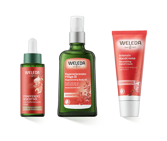 De Weleda Granaatappel huidverzorgingslijn voor gezicht en lichaam is precies afgestemd op de behoeften van de rijpere, veeleisende huid. De huid vanaf 40 jaar ondergaat verschillende veranderingen en een overgang naar een nieuwe levensfase. De krachtige antioxidanten van granaatappelpitolie en andere extracten bieden optimale ondersteuning. Ze helpen de dagelijkse stress zoals vrije radicalen beter af te weren. De huid wordt ook intensief gehydrateerd. De anti-aging eigenschappen helpen de elasticiteit en stevigheid van de teint te behouden. Zo kunnen fijne lijntjes en rimpels worden geminimaliseerd en ziet de huid er ontkreukt en gerevitaliseerd uit. De vernieuwing van de huidcellen wordt geactiveerd. Dag-, nacht- en lichaamsverzorging zijn ook verkrijgbaar. Van de olie van de granaatappelpitjes tot het sap worden verschillende actieve ingrediënten uit de vrucht gebruikt, die al duizenden jaren bekend is.